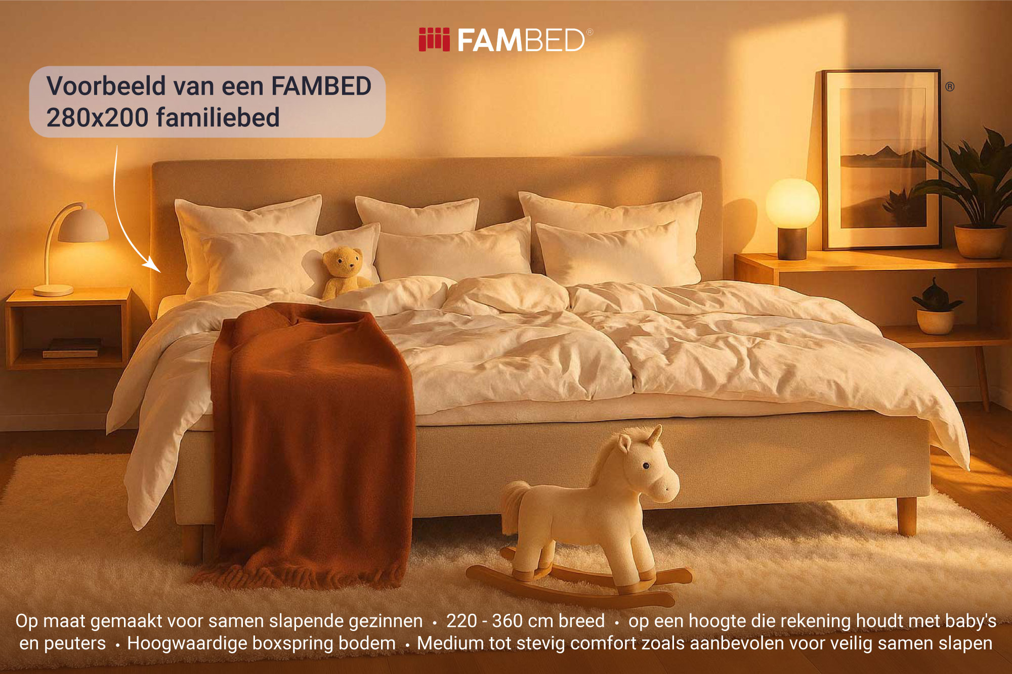 Een FamBed® familieseng is op maat gemaakt voor gezinnen die samslapen. Alle ontwerp- en materiaalkeuzes zijn gericht op een veilige en rustige samslaapervaring. In de onderstaande sectie kun je jouw kleuren en extra opties kiezen voor de perfecte samslaapoplossing.